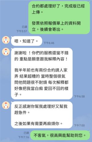案件完成後,他表示蠻謝謝我們的,不只是因為合約的部分,更是因為我們願意去解釋為什麼不行的理由讓他瞭解,他公司之前其實有請別的人協助處理過合約,除了費用較高之外,更重要的是對方都不太願意去解釋合約為什麼需要這樣寫或修改,如果有詢問還會不太耐煩,老闆表示,他再怎樣也是一間公司的老闆,雖然對法律不是很懂但是我們願意稍微解釋他還是可以理解我們所講的內容,而之前幫他們處理的那位先生在對話總有種不被尊重的感覺,好像每次問問題都會被當成什麼都不懂的白痴(原話真是這樣),所以相較之下,更是特別謝謝我們。